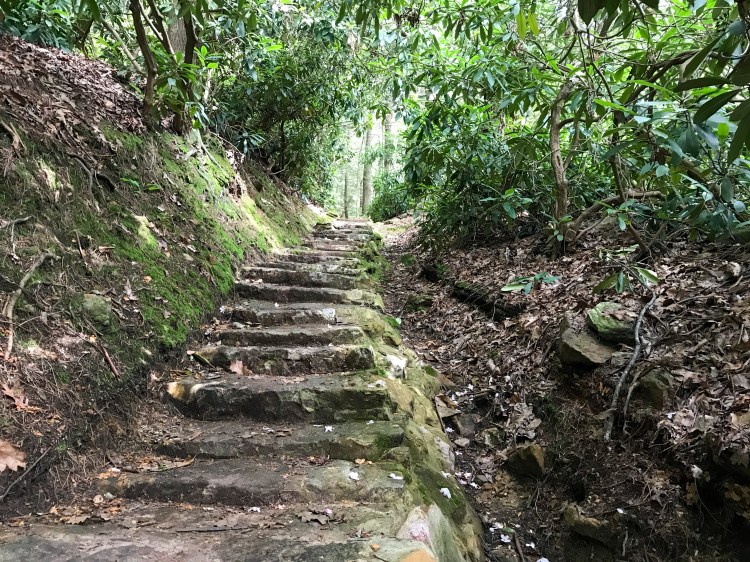 The trail was a tunnel of wild rhododendrons, which were past their peak bloom, but still created a magical tunnel that made me feel as though I had stumbled into Frances Hodgson Burnett’s The Secret Garden. There were mossy steps carved into the rock, crystalline streams, and a mist that hung in the air as though it were a magic spell. While the trail was rocky and somewhat difficult because you had to watch every step, it was nice to go slowly and take it all in. This being our last day, Robin and I were both feeling that sense of “just a little more” that often comes at the end of a good trip.
