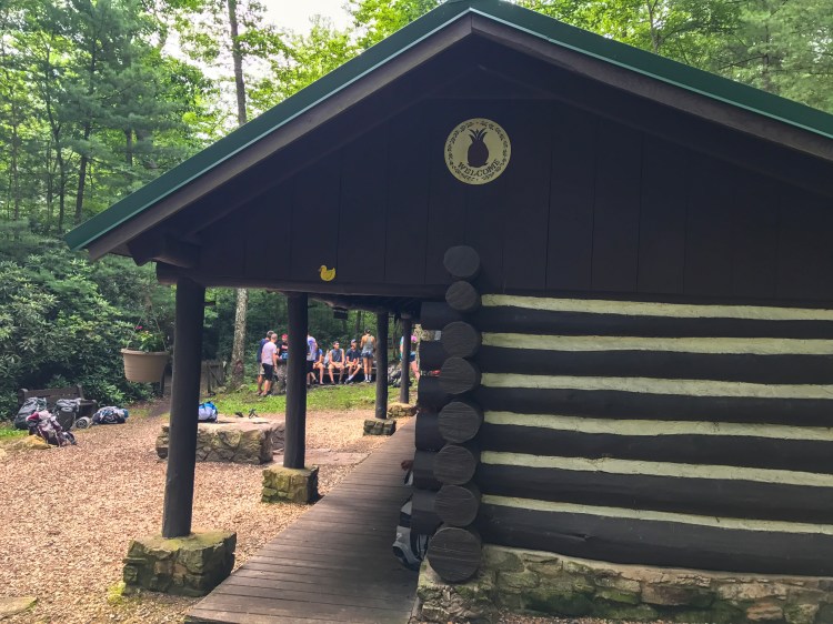 The shelter we encountered was one of the most scenic we had come upon, with hanging plants, reading material, and a pineapple decoration on the peak–a symbol of hospitality. I’m guessing that a group of dedicated volunteers must visit it regulary. A group of day hikers was there having lunch, so we didn’t linger, but we agreed that it was by far the most welcoming shelter we had seen.