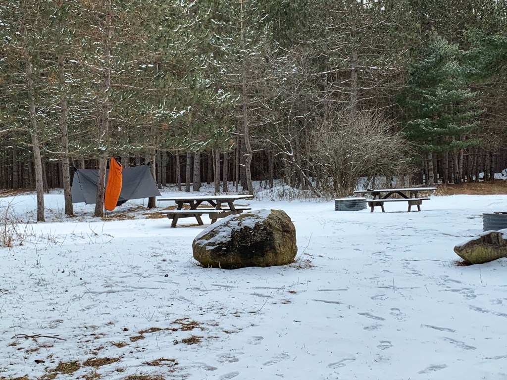 The first cold-weather trip that I went on a few years ago was designed with safety and comfort in mind. We met Friday night at the Twinwood Lake SFCG near Newaygo and car camped. I was using my new Dream Hammock for the first time, and had a 5-degree sleeping bag and Thermarest insulated pad to keep me warm, in addition to the Eno tarp that kept the wind and snow off of me. I slept warm and well.