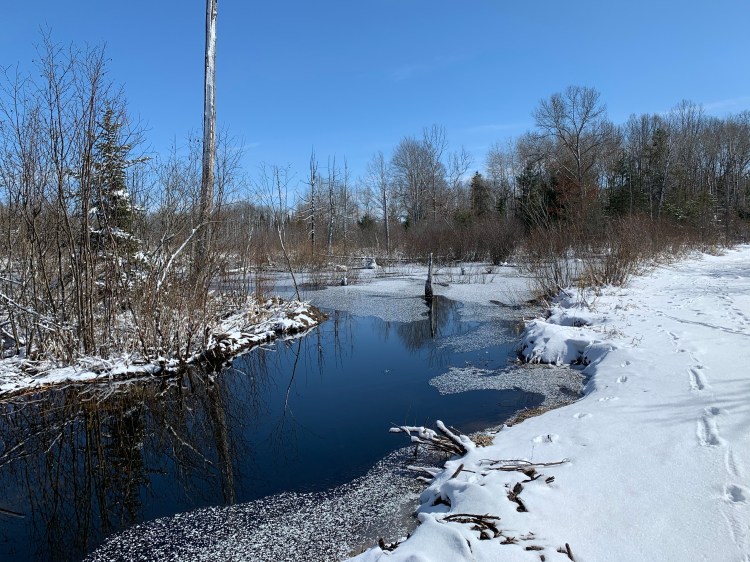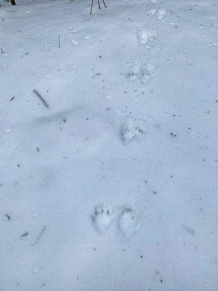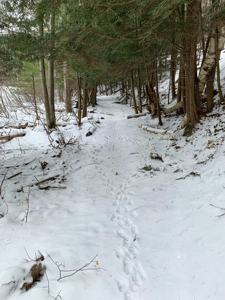 Because I was ready to go earlier, but the slower hiker in general, I took off on the trail before the rest of the group left camp. There was fresh snow on the trail, and although this section of trail (in the Sand Lakes Quiet Area) had seen plenty of traffic and the older snow was well-tamped down, there were animal tracks everywhere, and mine were the first human tracks in the fresh fluff. Giant hemlocks overhung the trail, and chickadees flitted in and out of the brush.