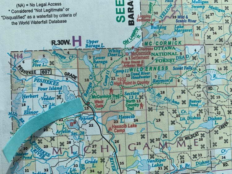 That lesson hit home on a recent trip to the Upper Peninsula. One of my friends and I were camped in the Elliott Donnelly Wilderness off of County Road 550, between Marquette and Big Bay. We were planning to backpack the North Country Trail over the next few days, and wanted to leave a car at the trailhead on Harrison Road near Little Garlic Falls, drive another car to a trailhead near the Silver Lake Basin, and hike the 20 miles in between, before leap-frogging a car to the McCormick Wilderness and continuing our hike. My road atlas showed that we could either take seasonal roads, or head up 550, which is paved, to Big Bay, then cut across to 510, and head back south on 510 to our Silver Lake Basin destination. The atlas showed the paved road trip to be about 90% more miles than the seasonal road option, so we took the seasonal roads. This turned out to be a mistake.