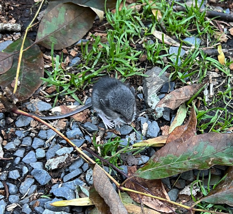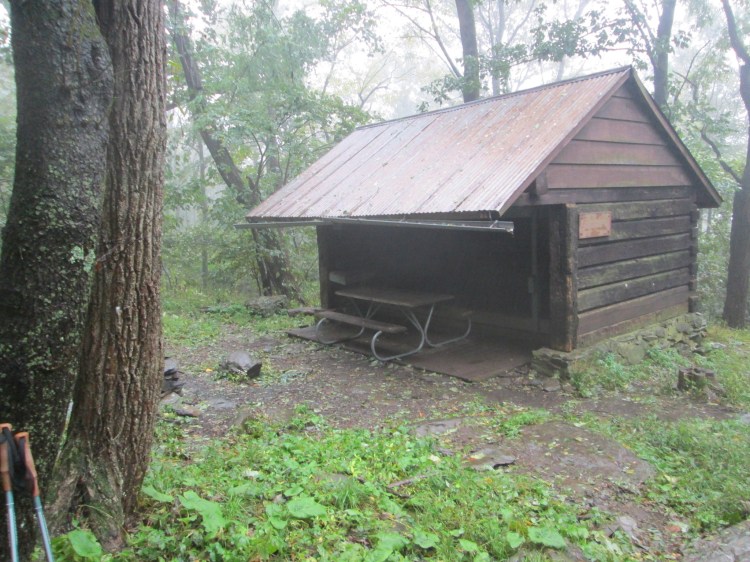 We were headed to the Blackrocks shelter, a location I’d been to before on a previous trip, so I was excited about the gorgeous view, hoping it would clear up either today or tomorrow morning so that we could enjoy it. However, the rain persisted for the whole day, which actually turned out to be a good thing, because when we arrived at the shelter, we discovered the water source was dry, and our only option to refill our water was to collect it from the eaves as the rain drained down the roof of the shelter. We set up our cook pot under the drip line, and before long were filtering water to cook dinner, for coffee and breakfast in the morning, and fill our water bottles for the following day’s hike. When we went to bed, I spent a little time reading the trail log, enjoying the goofy entries, messages from hiker to hiker, poems, weather reports, etc. that had been logged. Out of the corner of my eye, I saw something scurry in the corner–my first shelter mouse. Later, when I turned off my headlamp and tried to go to sleep, the mouse bravely (or stupidly) made a run at my pillow and head, which led to serious shrieking and flailing, but the mouse didn’t bother me again for the rest of the night.