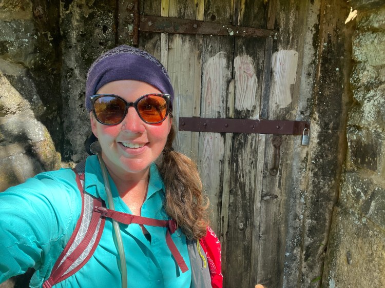 Next we ventured to Lewis Falls, parking near the Lewis Mountain wayside. We had hiked past the trail to these falls earlier in the week, but hadn’t taken the time to explore. This time, I asked a ranger about the trail, which she declared one of her favorites, and highlighted the map to show me how to make the hike a loop with the AT. As we began our descent, it was pretty easy hiking, and then about a mile in, it became a rock scramble with a drop off that induced us to sing, “We’re about to do something sketchy, doo-dah, doo-dah” to the tune of the Foghorn Leghorn song in the old Looney Tunes cartoon. Eventually we made it to Lewis Falls, which was a bit of a letdown after the majesty of Dark Hollow Falls, but it was still a nice hike. We ran into a mysterious door in the mountain on our way back, which was probably my favorite part of the hike.