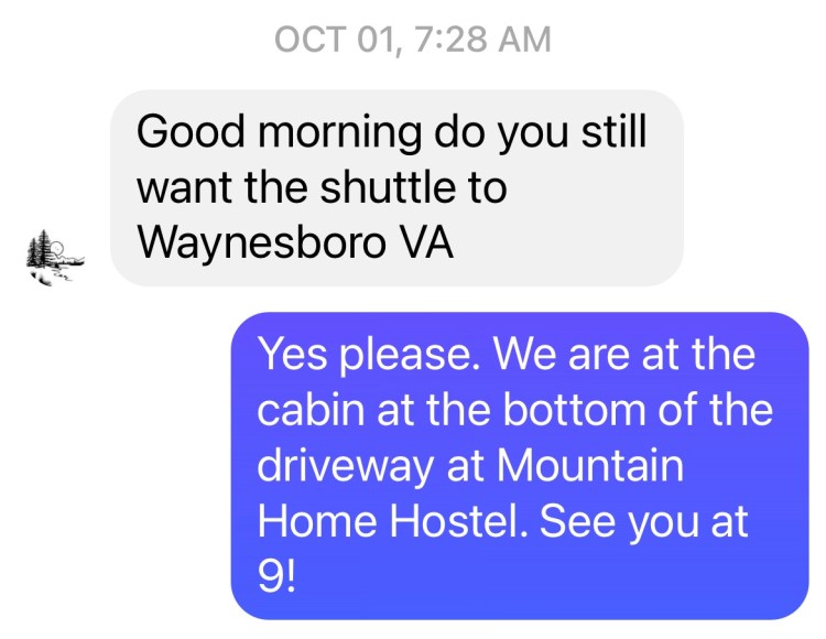 “Do you still want the shuttle?” appeared in my Messenger alert. I watched the rain hitting the window pane, the tree limbs blowing in the early morning light, and wondered to myself if I did indeed want to be shuttled from this warm and dry place to the southern end of Shenandoah National Park at Rockfish Gap. Rain was forecast for the next two days.