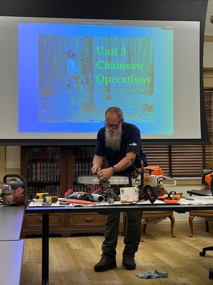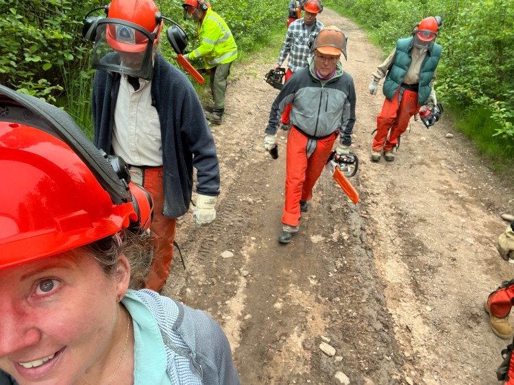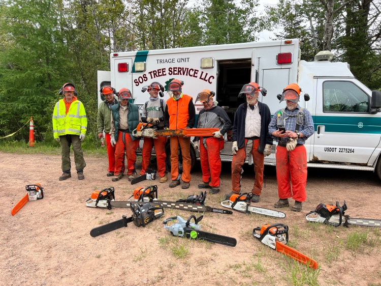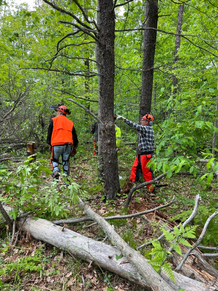 Then it was back up north for sawyer training. The first day was a classroom day. We met at the Peter White Library in Marquette, and from 8:00 a.m. to 4:00 p.m. learned the various parts of a chainsaw, how to adjust tension on the chain, how to sharpen the chain, and various other maintenance information. Then we moved onto cutting techniques, watching videos and looking at diagrams regarding how to size up a tree and how to take it down and control where it fell. We learned various techniques for cutting the wedge that would determine in what direction the tree would fall, and how to do the back cut so that a hinge of wood could control the tree’s fall as the sawyer left the area for safety. We learned techniques for bucking up fallen trees, and strategies to avoid getting the saw bar pinched in the kerf (the cut) as the pressure changed within the tree trunk.