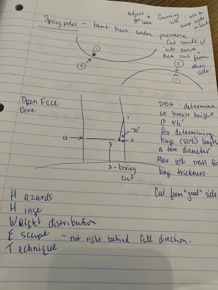 Safety was a huge part of the training. The NPS provided chaps, work gloves, hard hats and ear protection, and safety glasses free of charge to anyone attending the training, although I think most of us already had this gear. We learned about the most commonly injured areas when using a chainsaw (damage to thighs, lower legs, and forearm, and kickbacks hitting the shoulder, face and neck) and how to consider our own limitations, such as fatigue or lack of knowledge in approaching a complicated situation, such as a blowdown of many trees where it might be difficult to identify where the binds and pivot points might be. We also learned about keeping others safe, as there might be hikers or other workers in the area. By the end of the day, I felt like my head might explode, there was so much new information. My notebook was full of diagrams regarding hinges, and the formula for deciding how deep into the tree trunk they should be, and how to approach spring-poled trees, and trees suspended in different ways.