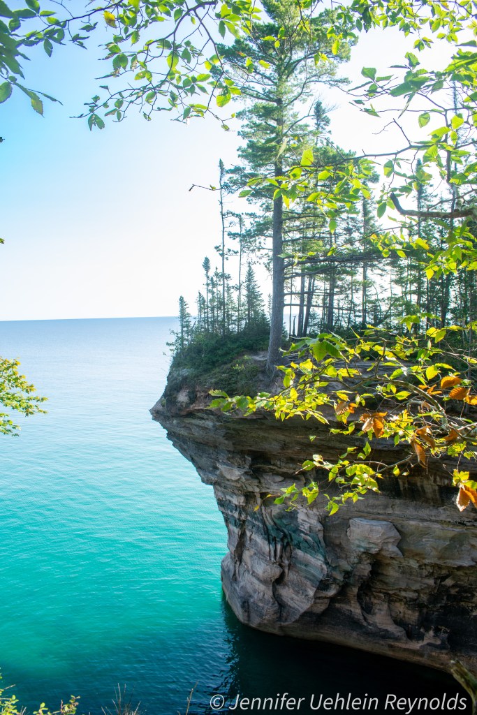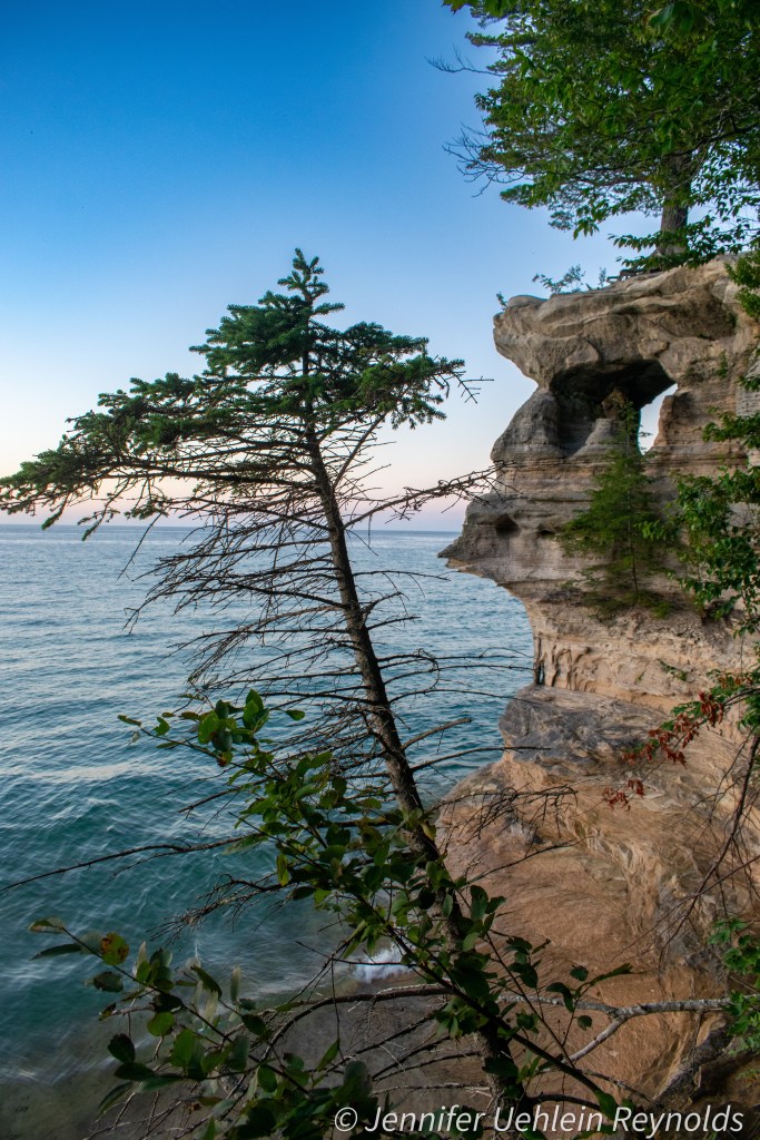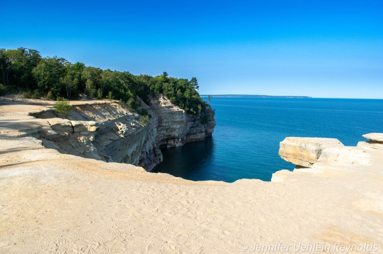 We began our hike toward the Cliffs campsite around 9:30, continuing to enjoy the incredible views of rock formations and Lake Superior’s incredible color. It was another 11 mile day, but the scenic view paths kept calling! One particular view was quite disconcerting: What looked like a wide beach was actually a dramatic drop off–what appeared to be sand was blond sandstone with fine gravel on top, and upon closer inspection, the water that appeared just beyond the “beach” was Lake Superior, a good fifty feet or more below. It was definitely one of those places where I had no desire to get terribly close to the edge.