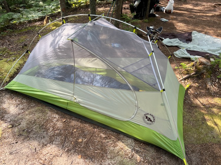 When I put up my tent at the Chapel campsite, I discovered I had a gear failure. I was using a Big Agnes Rattlesnake SR1 tent that I had bought from the REI used gear site about three years ago. When it had arrived, the plastic connector for the poles had a crack in it, but rather than return it, I had epoxied the crack, and it had held ever since. Until now. The connector was critical to providing the tension that gave the tent headroom. After messing around with it a bit on my own, and then consulting with David, we rigged up a system that employed my trekking poles to keep the tent up. The rainfly did not fit very well over this system, but there was no additional rain in the forecast, so I hoped for the best. It was a bit nerve wracking to have my shelter amiss on day two of a five day trip, though! (Now that I’m home, I’m hoping that I can get a replacement part from Big Agnes!)