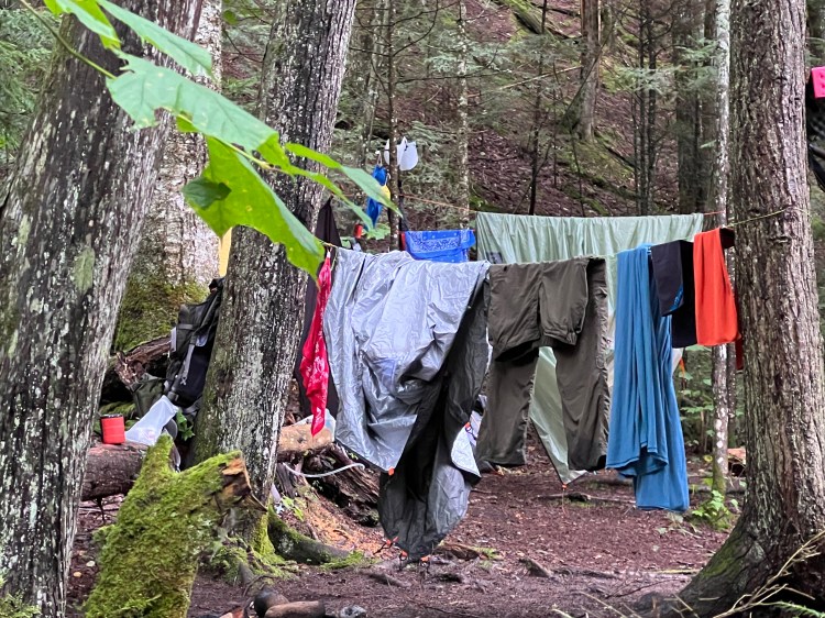 Upon arrival, we discovered the creek area to be darkly shaded by cedar and hemlock trees, with an air of enchantment about it. The heavy wind we could hear in the treetops was not present at ground level, so our damp gear had a slim chance of drying, even though we strung clotheslines from the trees and hung gear on tree branches. I took an hour or so to go exploring with my camera to give my tent a chance to air out before I pitched it.