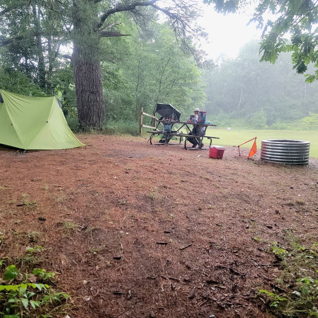The rain stopped long enough to fool us into thinking we could cook dinner on the picnic table. This pattern continued throughout the evening: rain, then a little bit of not rain, then more… Eventually we gave up and just went to bed so we could be dry in our tents/hammocks.