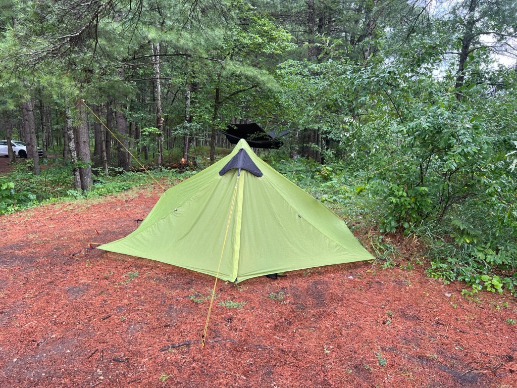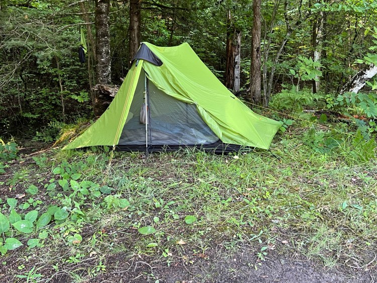 I was a little out of sorts, putting on my damp clothing from yesterday, and contemplating packing up a wet tent. I noticed that the hydration bladder I had left on the picnic table (stupid mistake on my part!) was now on the ground and no longer full of water. Upon closer inspection, I discovered a couple of big scratches in the vessel–probably from a raccoon. An expensive mistake on my part, I discovered upon ordering a new one after returning home.