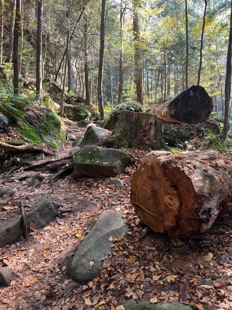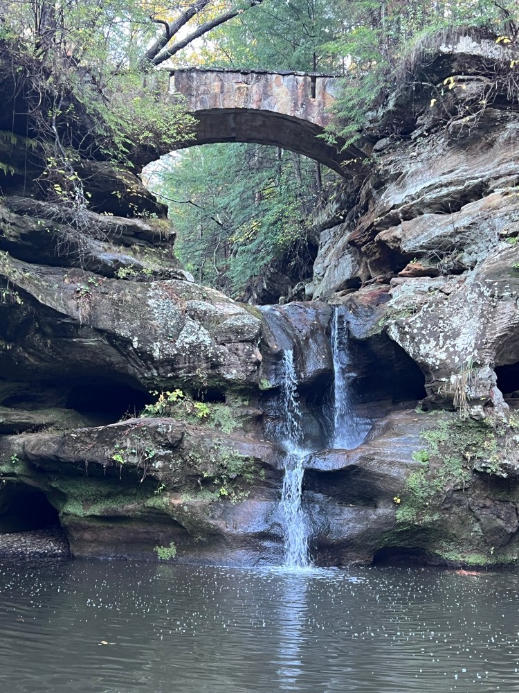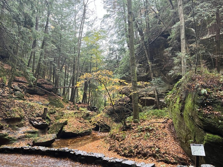 Several years ago, my husband Geoff and I rented an Airbnb in Athens, Ohio in April and spent the day exploring from the Hocking Hills State Park Visitors’ Center, hiking the 5ish mile loop between the visitor center and Cedar Falls, which brings you up along the ridge for half of the hike, and through the river gorge for the second half of the hike, depending which direction you go. Because the ridge’s scenery is a bit anticlimactic after the river gorge, some prefer to do the hike clockwise from the visitor’s center, but if you arrive early and have the park mostly to yourself, if you hike the river gorge portion first (counterclockwise from the visitor center) you’ll have the prettiest section all to yourself. On this trip, we also made a quick detour to Devil’s Bathtub, which can also be accessed from the visitor center parking lot.