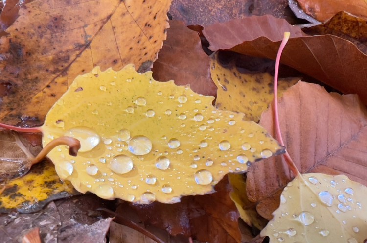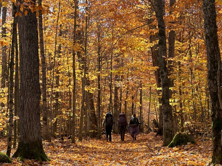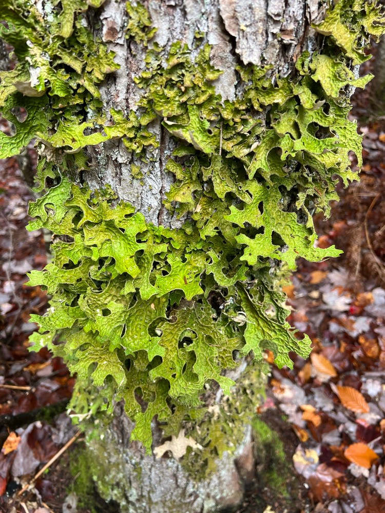 As we headed along the trail back toward the Lower Falls, we passed through forests still gold with fall color, and some beautiful bogs that thankfully had boardwalks to aid us along. The sun came out occasionally. We stopped at the Old Stove backcountry campsite for lunch, where it began to rain again. While there was not a clear view of the river, and no obvious reason why the site was called “Old Stove,” we did enjoy spotting an unusual lichen growing from a tree–it looked kind of like kelp.