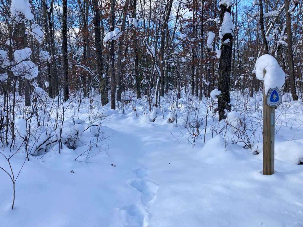 My buddy David responded positively to my invitation to hike this section, and as the date grew near, we discussed logistics. Since David had an appointment in Newaygo the day before our hike, he scouted out our trailhead and reported back that the trail looked like it had a good six inches of snow, and since it was a relatively flat section, suggested that crosscountry skis might be an efficient option. I hadn’t gotten my skis out yet this year, but decided to be brave and go for it. Given that David has done ski patrol for the Birkie crosscountry ski race in Hayward, Wisconsin for more than 30 years, I figured I’d be in good hands.