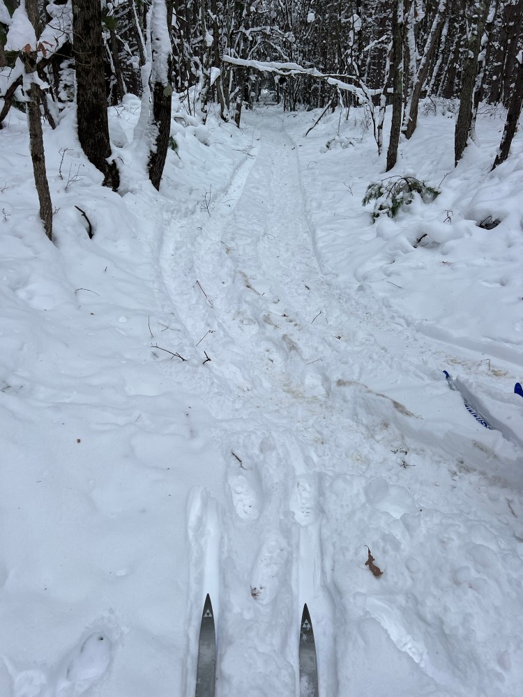 As I clipped into my ski bindings and looked down the trail, I could see snow dolloped on the tree branches, especially the pines, bending the branches low. Down the path, it looked a bit like a tunnel. An ATV had been down the path, so the snow was packed and the going was easy. It was about 20 degrees out, and the snow was crisp. Ideal conditions.
